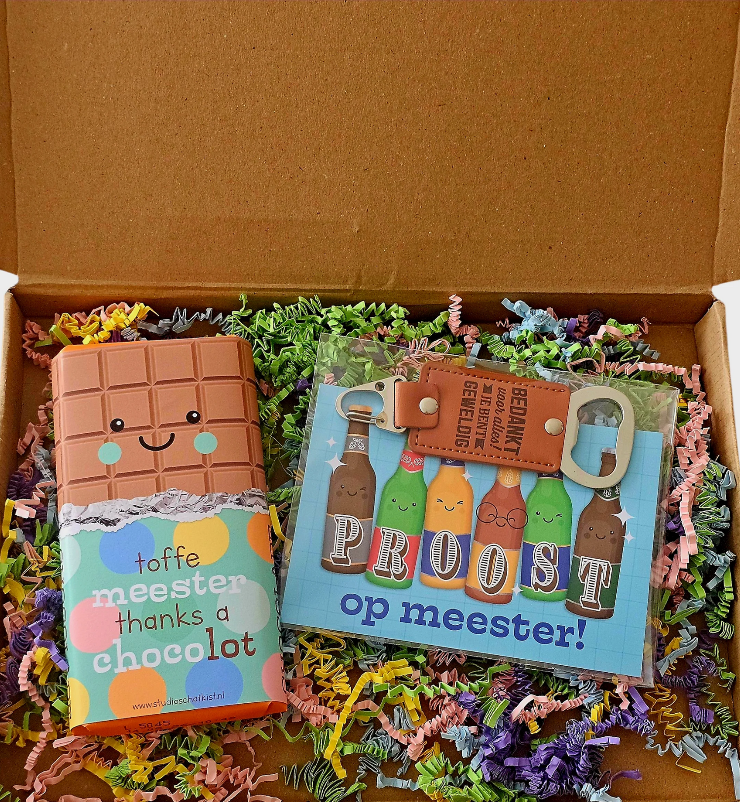 Verras de meester met deze originele cadeaubox, perfect als bedankje aan het einde van het schooljaar of bij een speciale gelegenheid. In deze vrolijk gevulde box vind je: